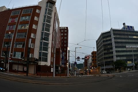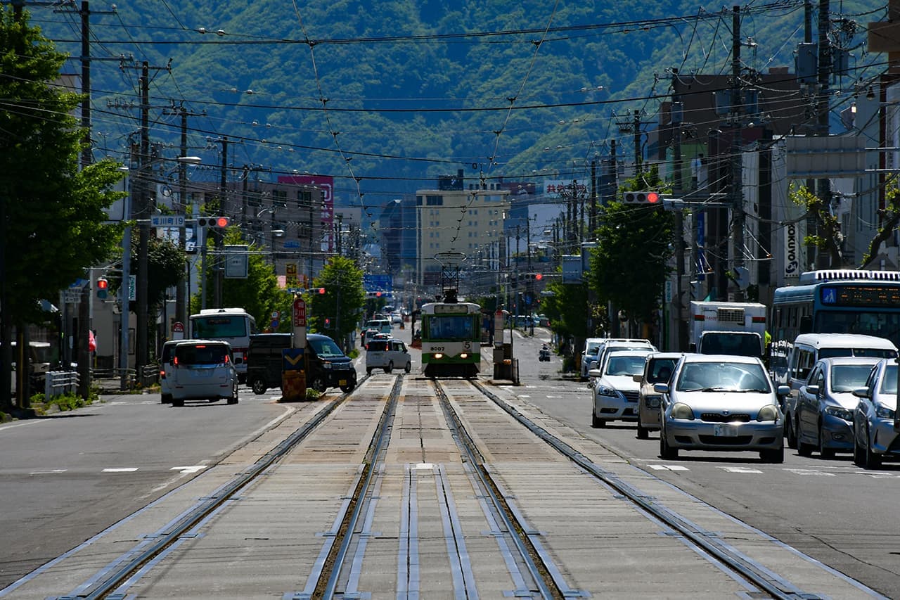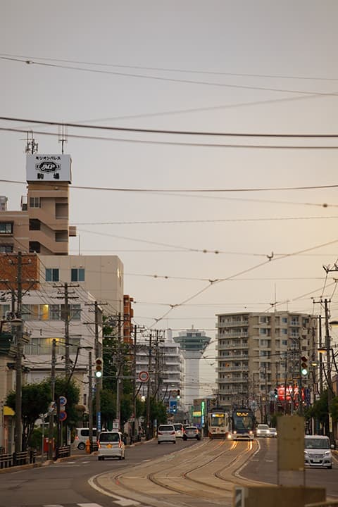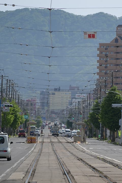 千代台から松風町までまっすぐに伸びた線路とあやとりをしてるような路面電車の電線