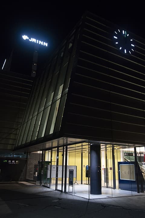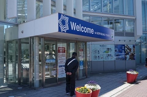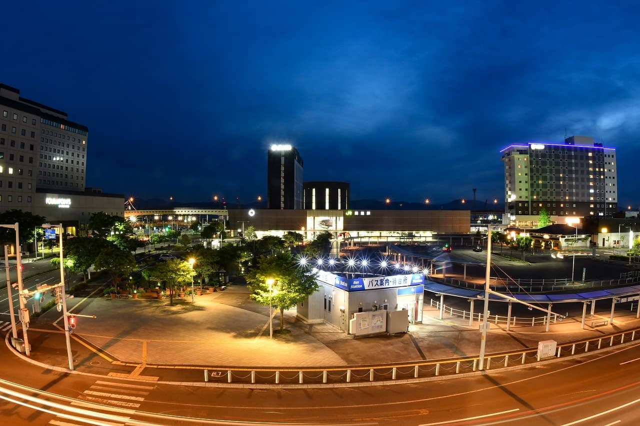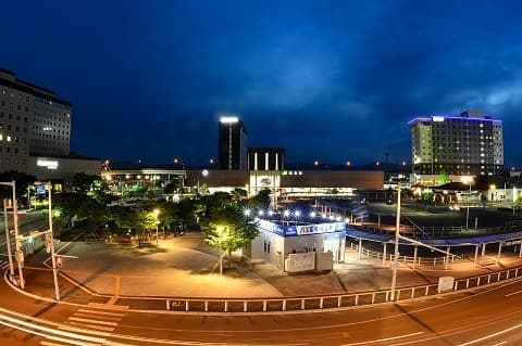 はこだてみらい館(キラリス函館3階)から見た函館駅。空は雲が広がっています。
