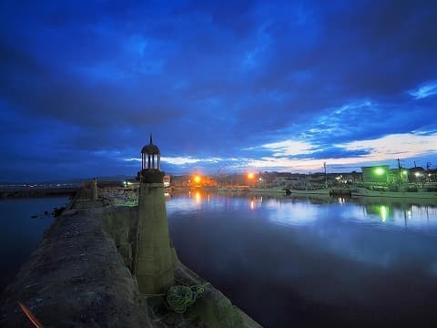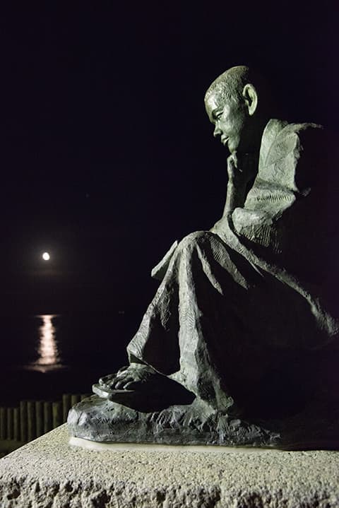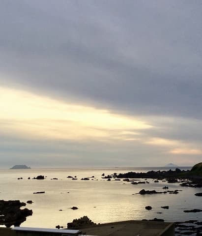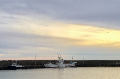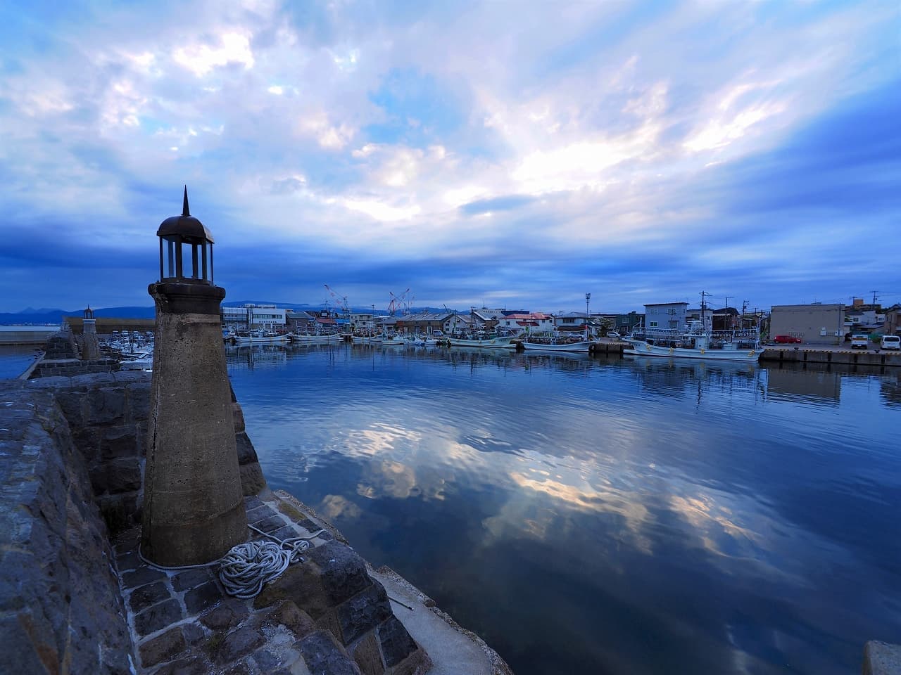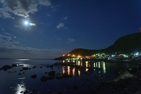 住吉漁港を左手に見ながら撮影しました。東の空が少し明るくなってきましたが、南の空はまだまだ夜です。月が静かに津軽海峡を照らしていました。