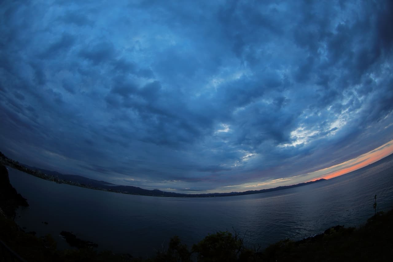 朝焼けを狙って家を出たけどあいにくの曇り空。でも魚眼で見上げて見ると今にも魔王が降りて来そうな空だった。