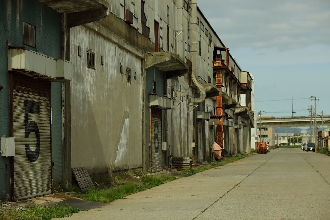 数字の書かれたシャッターのある倉庫群 そこだけ時間が止まっているよう