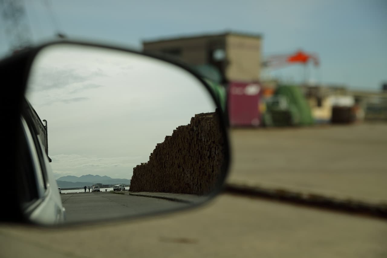 積み上げられた木材と岸壁をサイドミラー越しに見る