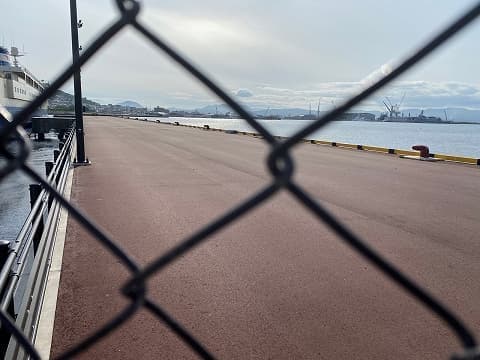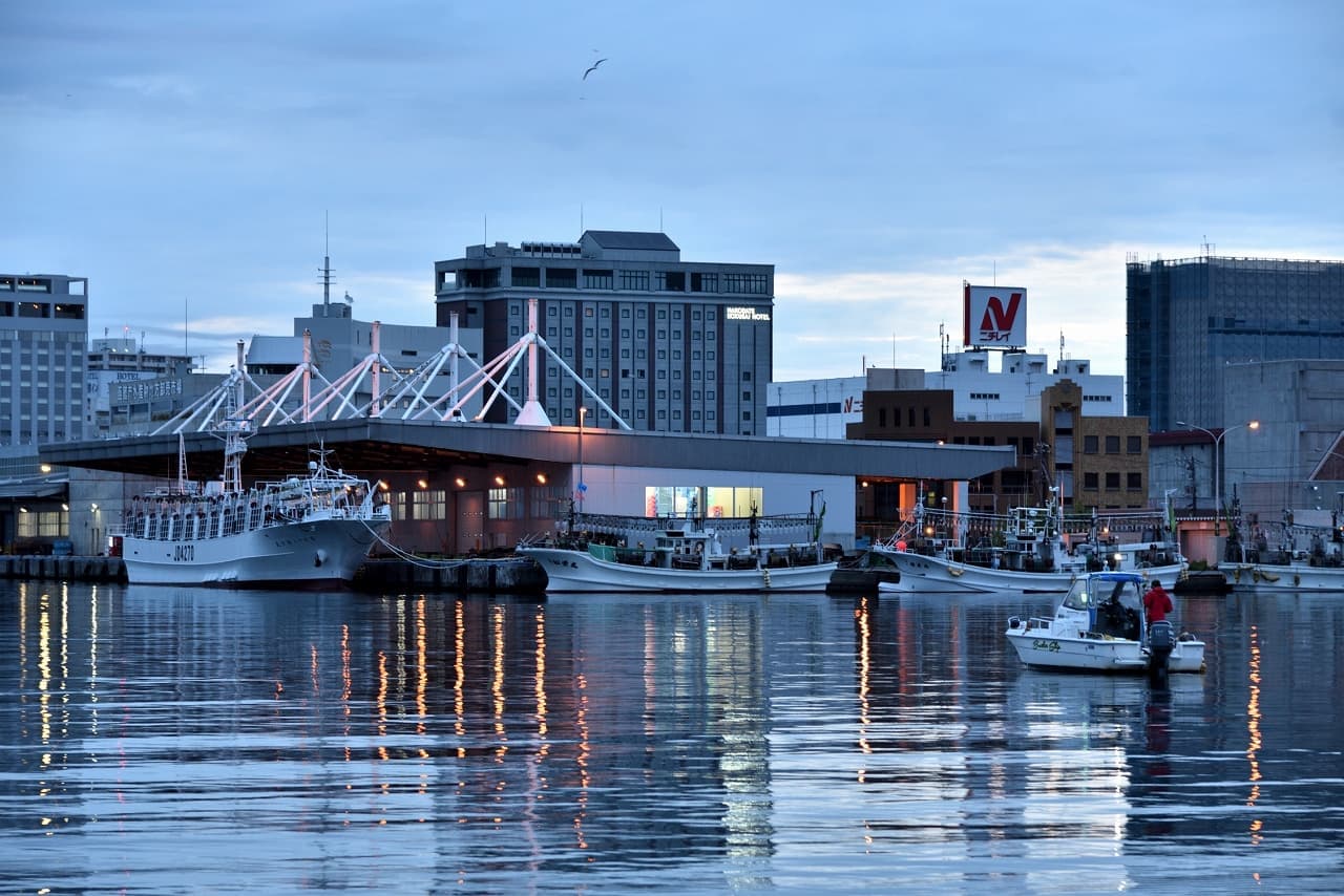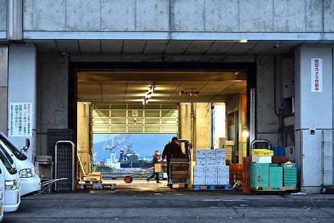 歩道上から望遠で水産物市場を撮影しました。そういえば今日はスルメイカ漁の解禁日です。