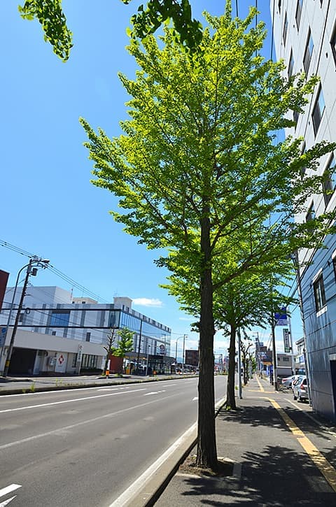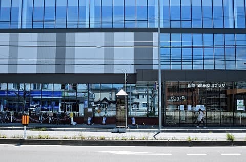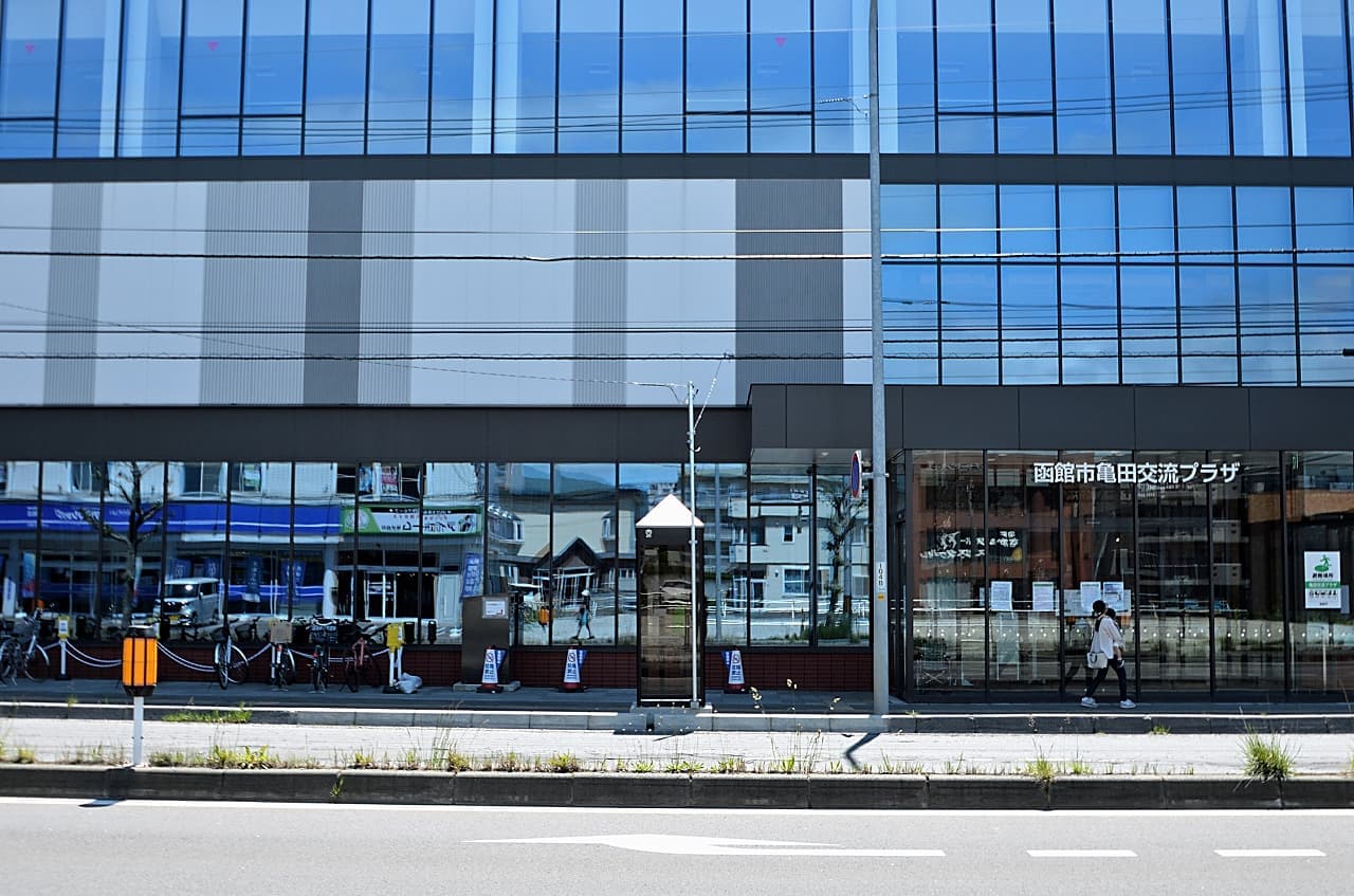 産業道路を挟んで向かい側から亀田交流プラザを撮影しました。交流プラザの窓ガラスが、鏡のように周りの風景を映しています。