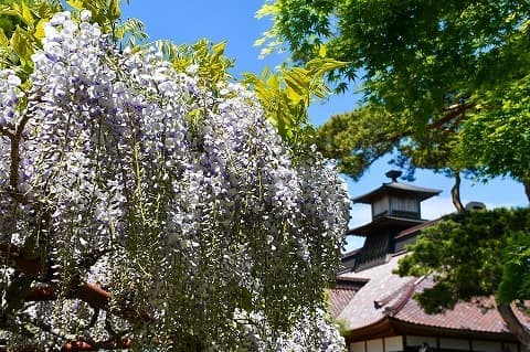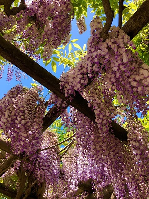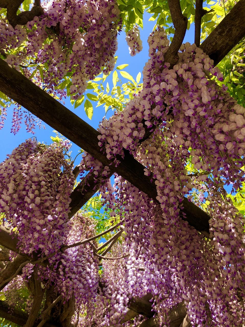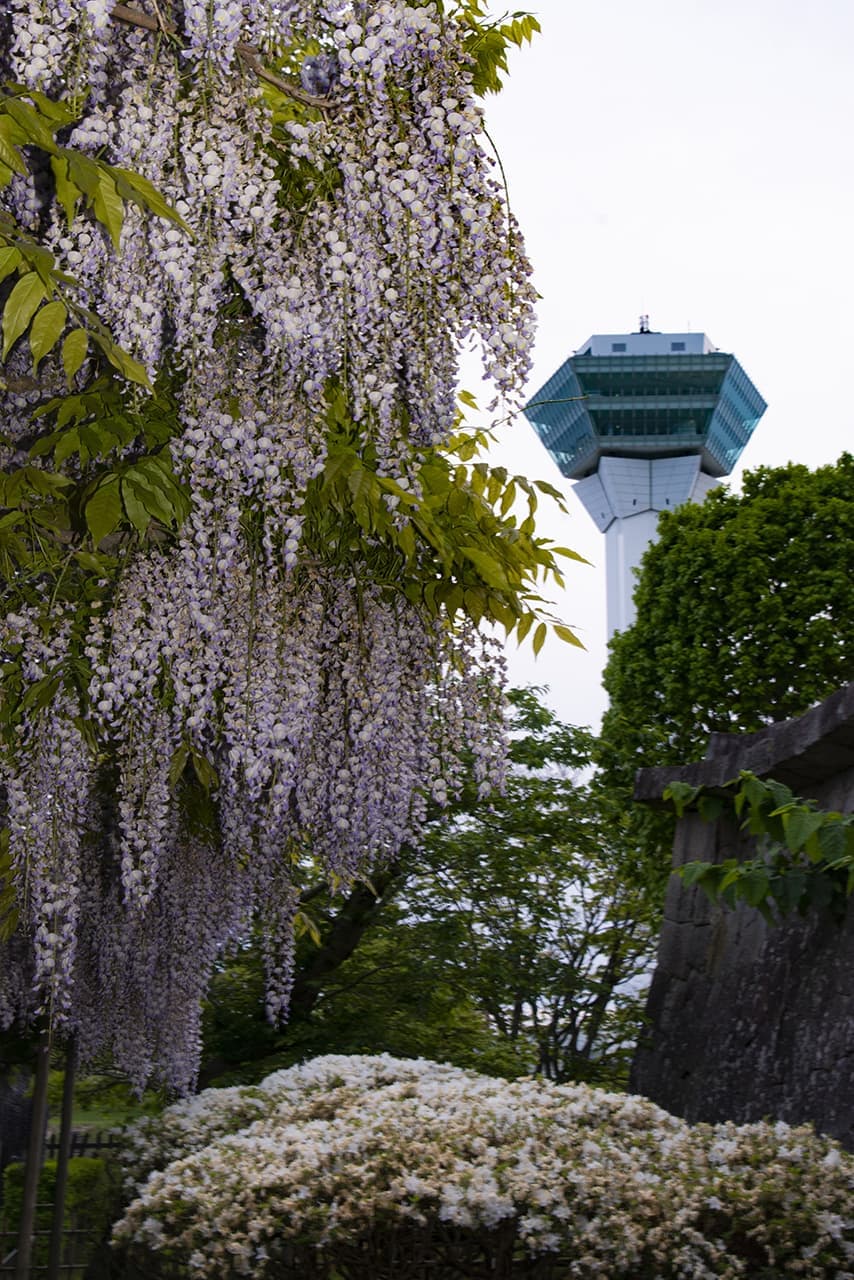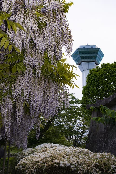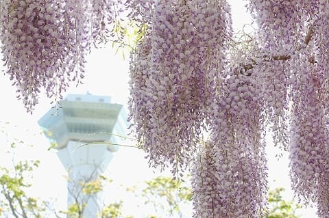 満開となった藤の花と五稜郭タワー 。これだけ咲いていれば、鬼が現れても大丈夫!
