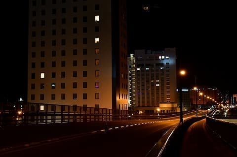 夜明け前、雲が流れています。街の大半はまだ眠りの中。