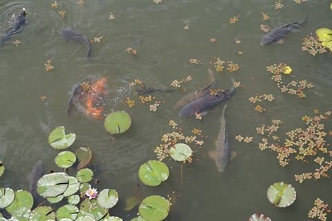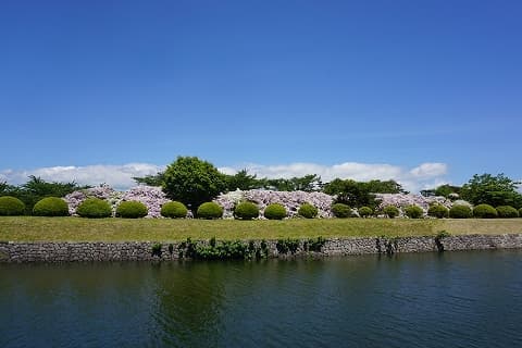 お堀の端に並ぶ〝マリモ〟が陽光に輝いていました。