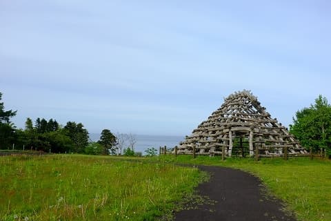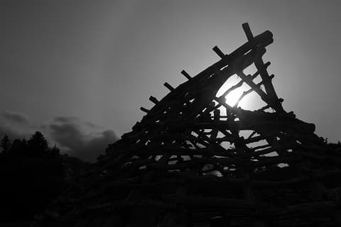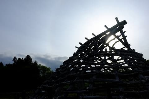 3枚とも縄文時代の一家を背負う男性が夕刻に家族の待つ住居に帰ってきた、といったイメージで撮りました。6月になり朝夕の寒さも緩み暖かくなる時期なので気分的にも住居が見えて「ホッとしたのであろうな」と思いました。
