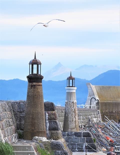 古い灯台と背景に駒ケ岳を配置してみました。偶然かもめが飛んできました。