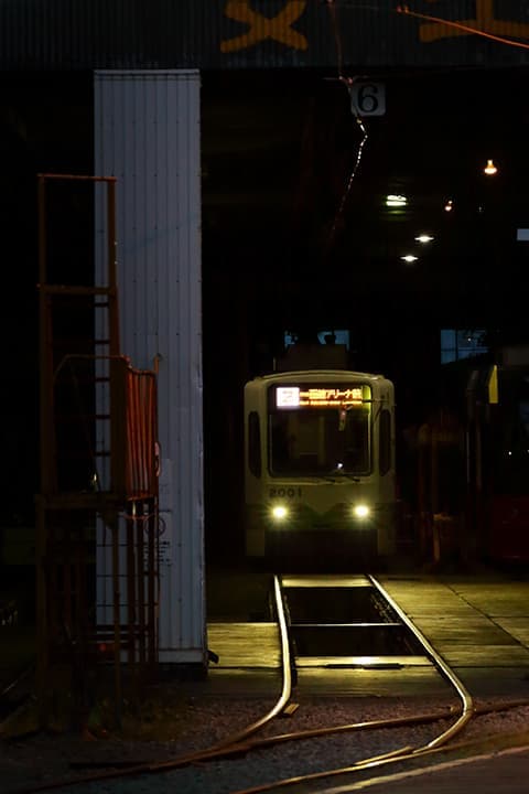 車庫の中の電車 ライトに照らされて浮き上がる軌道