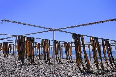 朝の雲はどこかへ消え、透き通るような青空へ まるで洗濯物のように干された昆布たち。