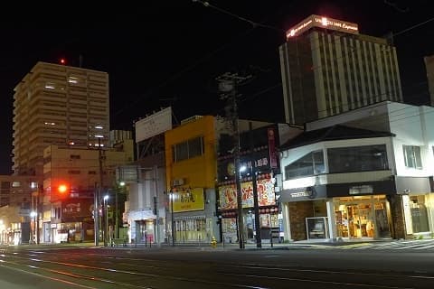 街灯はいつも通りですが、店舗の明かりはほぼ皆無,コロナ下の繁華街です。